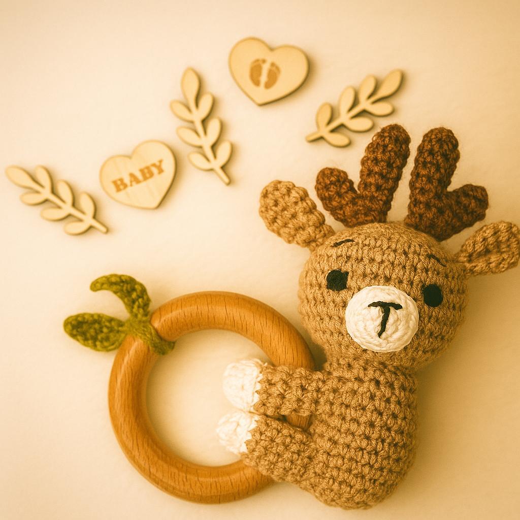 Der handgefertigte Rassel-Beißring Reh von Liliendesign vereint kindgerechtes Design, natürliche Materialien und höchste Qualität. Der süße, gehäkelte Reh-Kopf und -Körper besteht aus weicher Baumwolle, während der Ring aus robustem, unbehandeltem Buchenholz gefertigt ist – perfekt für kleine Babyhände.