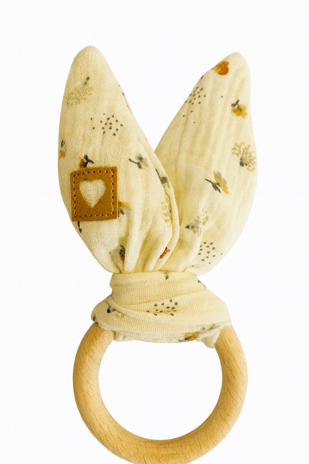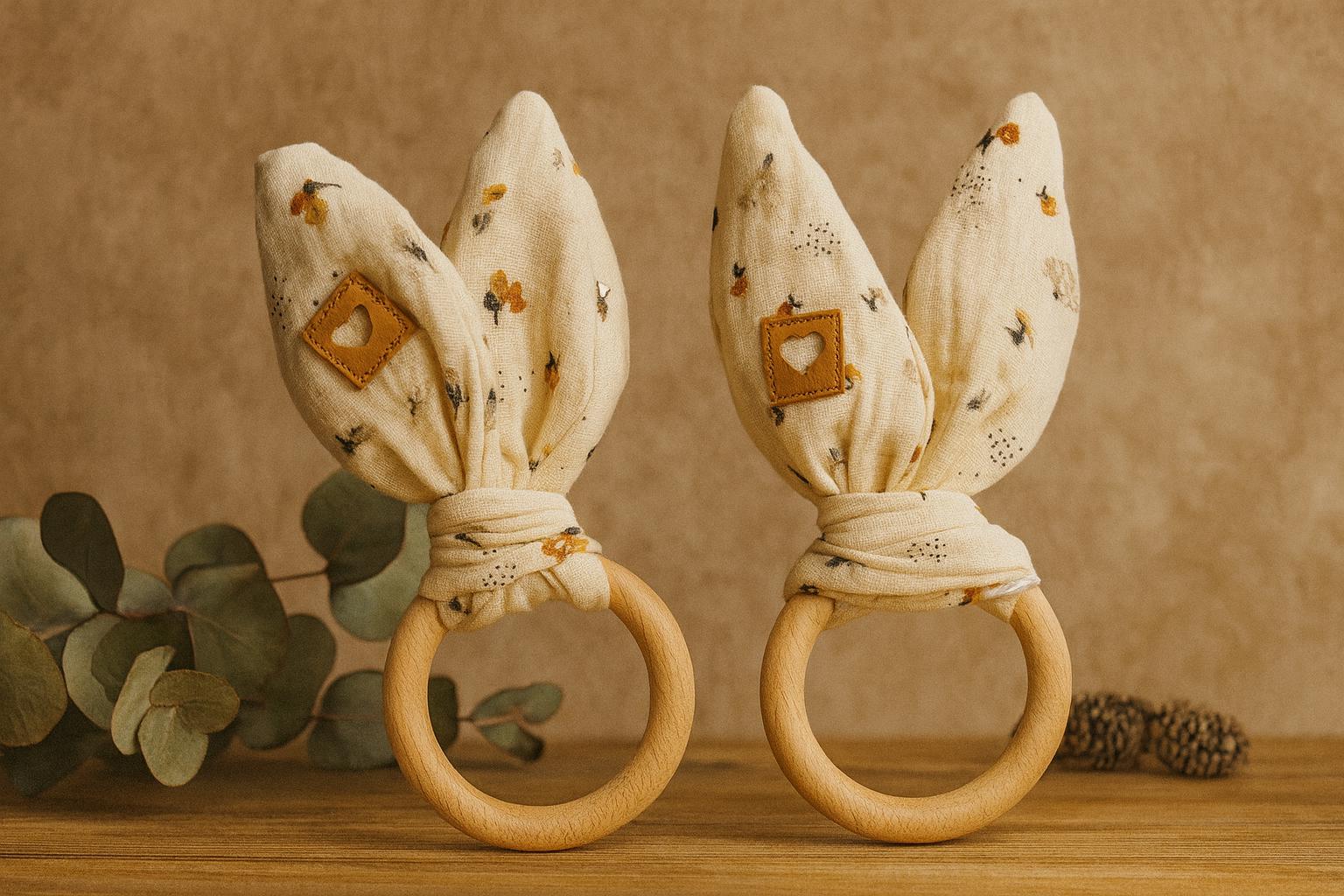 Die Hasenohren aus weichem Musselin-Stoff enthalten ein Knisterelement, das die auditive Wahrnehmung anregt und Babys zum Spielen animiert. Beim Zahnen kann der Holzring helfen, das gereizte Zahnfleisch sanft zu massieren und zu beruhigen.