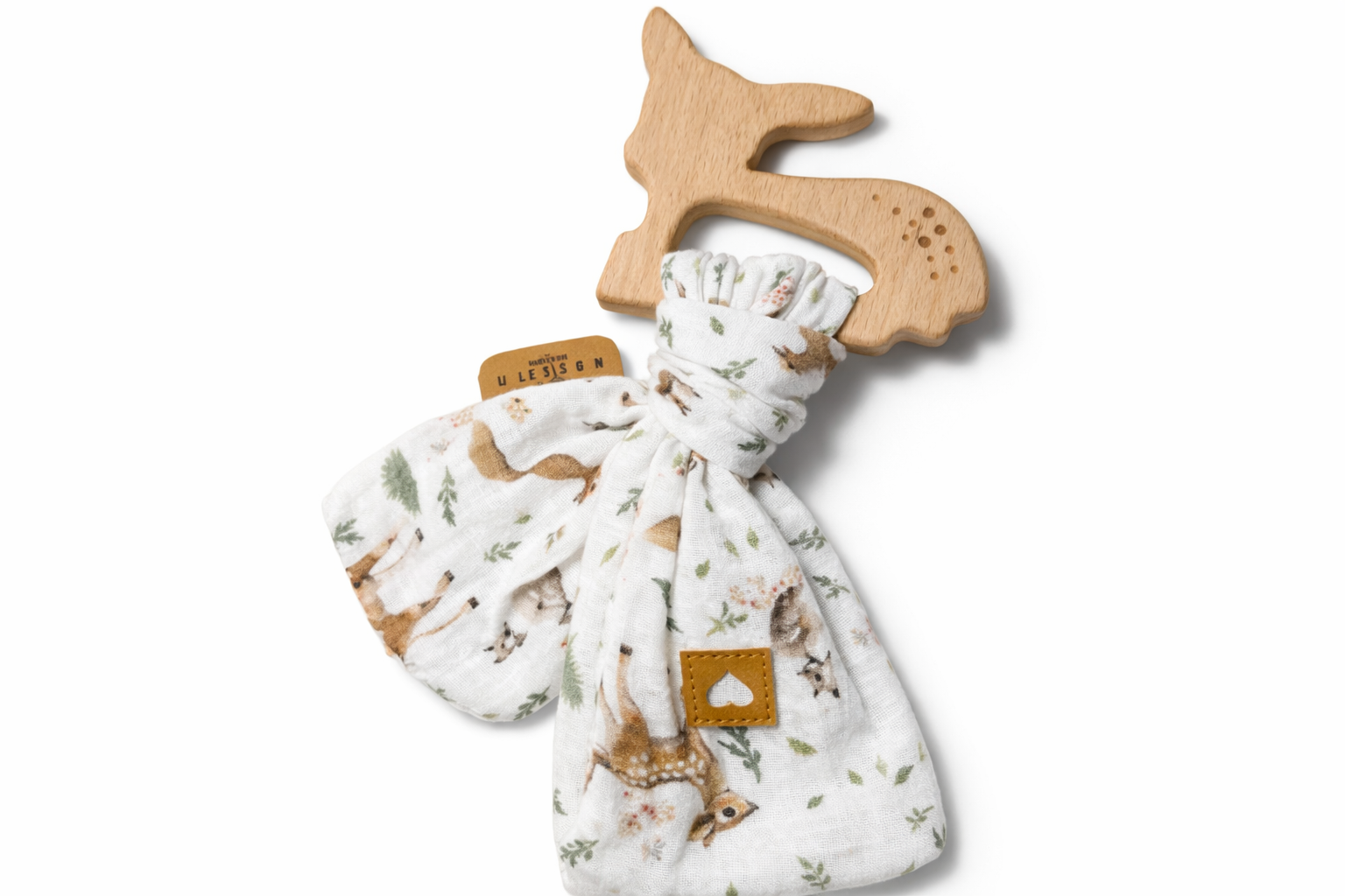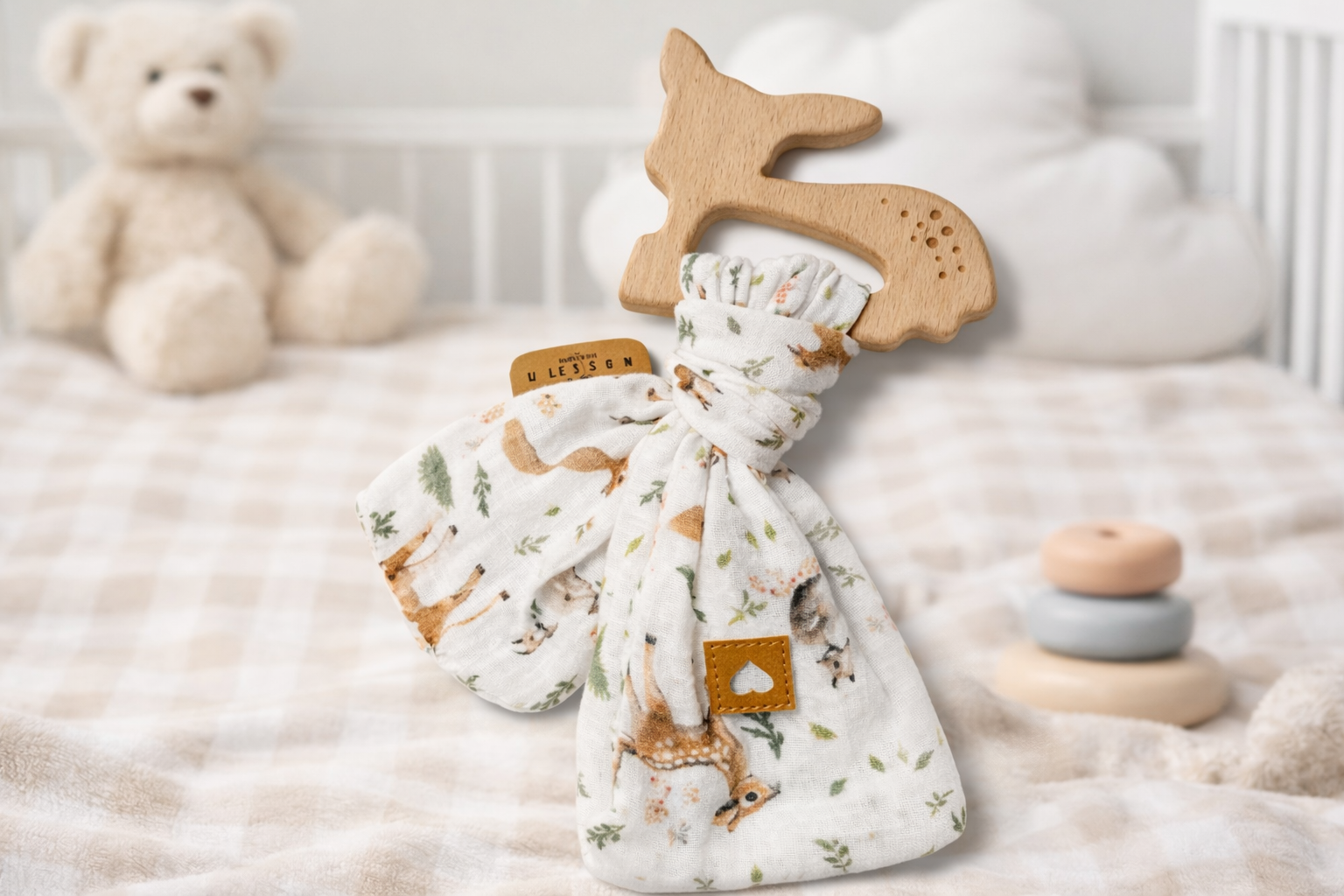 Handgemachtes Babyspielzeug – Beißring mit Musselin & Waldtiere-Motiv